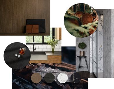 Turn down the color. Turn up the drama. Dark & Moody Luxe spaces are making a statement in the new year with dramatic color contrasts that convey a deep sense of luxury. Saturated colors like blacks, brown-blacks, and deep blues and greens are coming back into the home in a major way. Plus, more homeowners want to "escape at home" with exotic wood accent walls, bold open storage, and industrial surfaces that combine functionality with distinct, home-defining details.